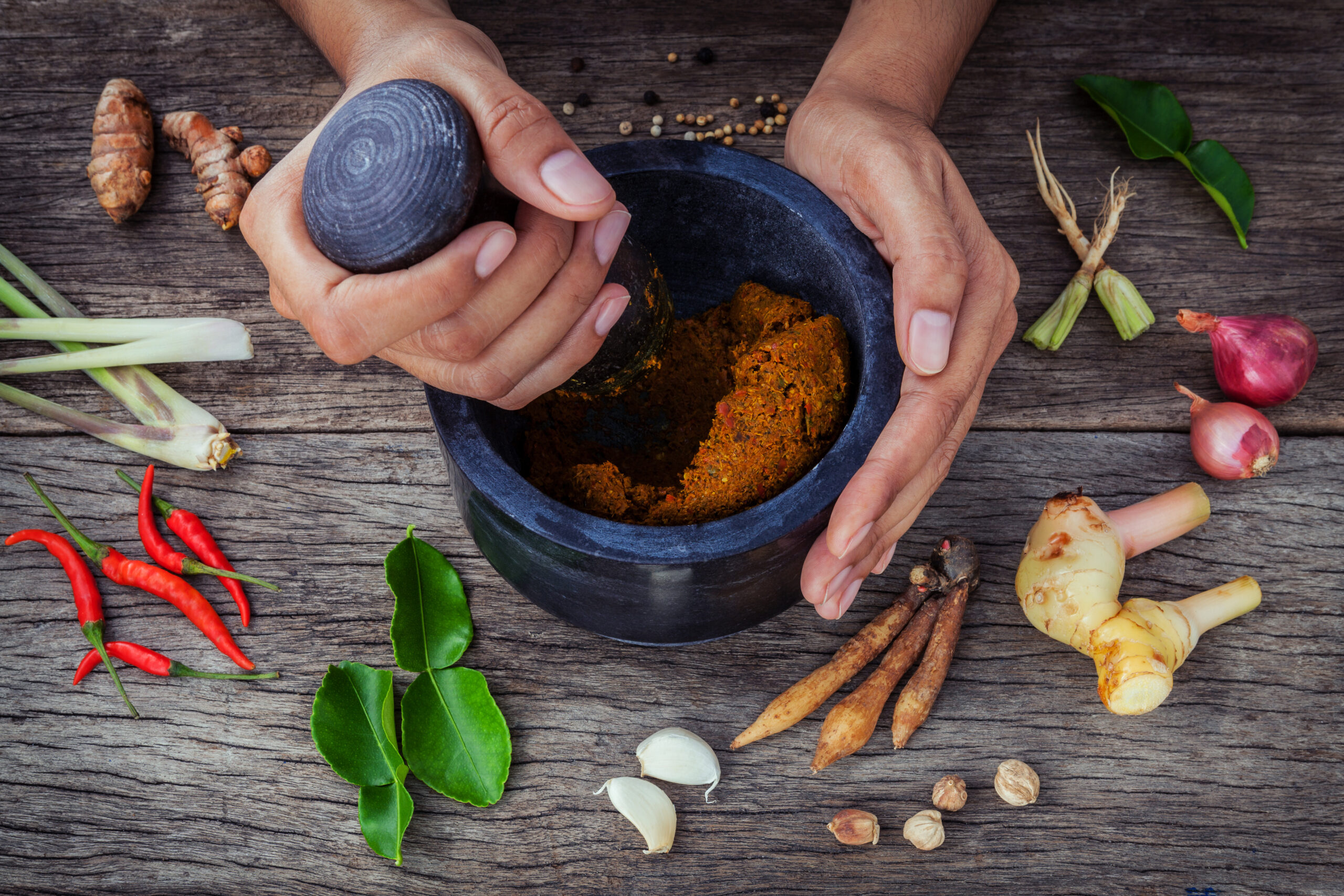Friske urter er også essentielle. Thaibasilikum giver en lakridsagtig, sød aroma, som ikke kan erstattes af almindelig basilikum. Den bruges i retter som pad krapow og grøn curry. Koriander — både blade og stængler — giver et grønt, frisk pift, der lyfter mange retter og tilføjer duft og lethed.