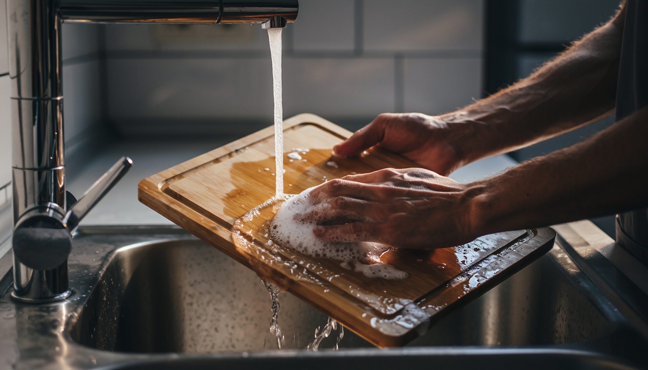 Et skarpt blad fungerer kun, hvis underlaget er i orden, og derfor er dit træskærebræt mindst lige så vigtigt som selve kniven. Træ er skånsomt mod knivens æg og giver en stabil, behagelig overflade at arbejde på. Men som alt andet natur materiale kræver det kærlig pleje. Efter hver brug bør du vaske brættet i hånden med mild sæbe og varmt vand. Aldrig i opvaskemaskinen — det er den sikreste vej til et bræt, der slår sig eller sprækker. Det er også vigtigt at huske at vaske dit træskærebræt på begge sider. Ellers slår det sig og bliver skævt. Når det er vasket, skal du tørre brættet grundigt og lade det stå frit, så luft kan cirkulere omkring det. Lader du det tørre fladt mod bordet, risikerer du, at fugten bliver fanget under brættet og skaber en skæv overflade. Et tørt bræt føles let, jævnt og varmt. Og først dér er det klar til at blive sat væk.